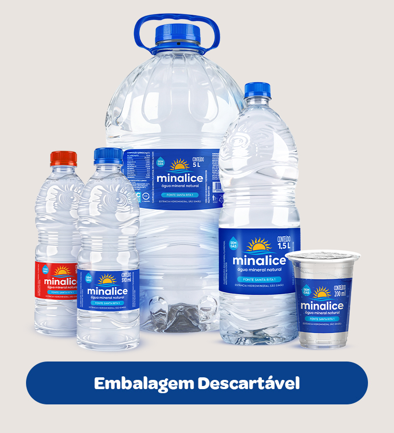 descartável: copo 200ml, 500ml natural e com gás, 1,5l, 5l e 10l.